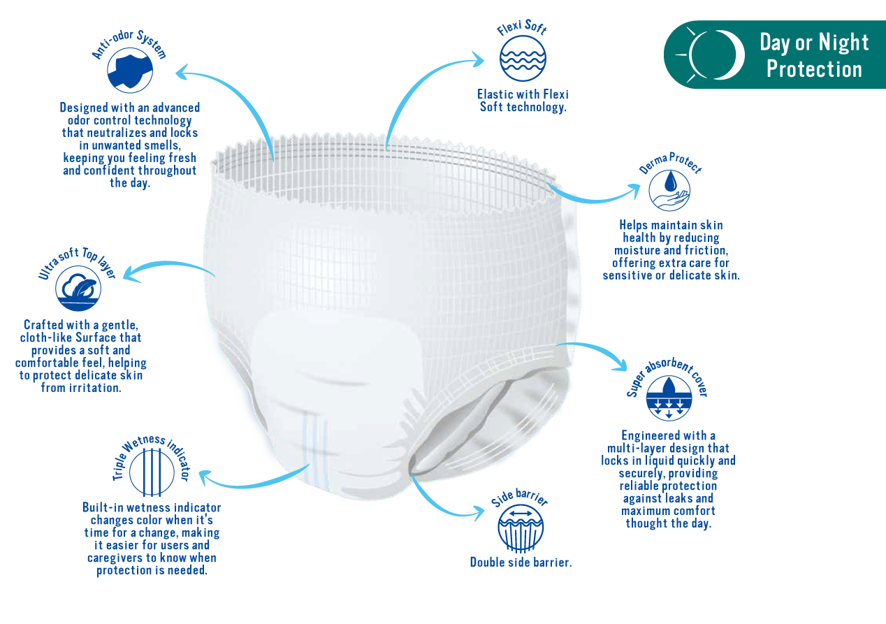 Unisex maximum absorbency disposable underwear, designed to provide security, comfort, and discretion for moderate incontinence. Engineered with advanced technology to deliver users a highly reliable and trustworthy protection system for everyday use.