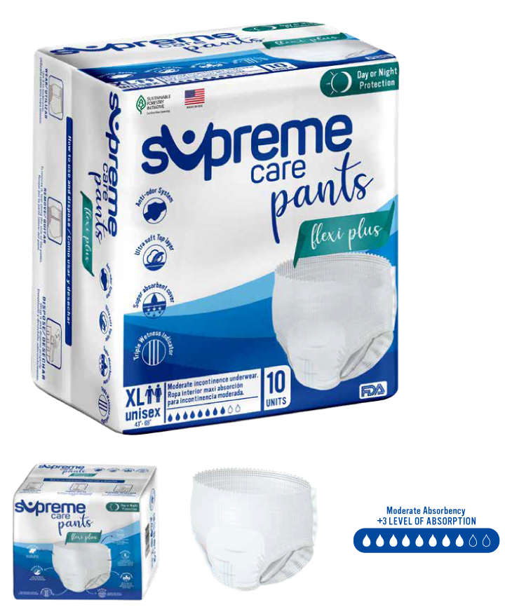 Supreme Care Pants Flexi Plus seamlessly combines cutting-edge absorbent technology with everyday comfort in an easy-to-wear underwear style—ideal for both men and women seeking dependable protection without compromising their lifestyle.